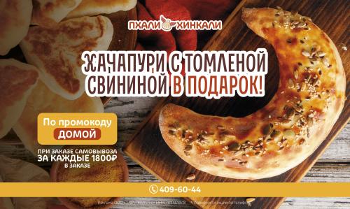 Хачапури с томлёной свининой в подарок по промокоду ДОМОЙ за заказы самовывозом за каждые 1800 рублей. Действует в приложении и на сайте ПхалиХинкали Колпино.