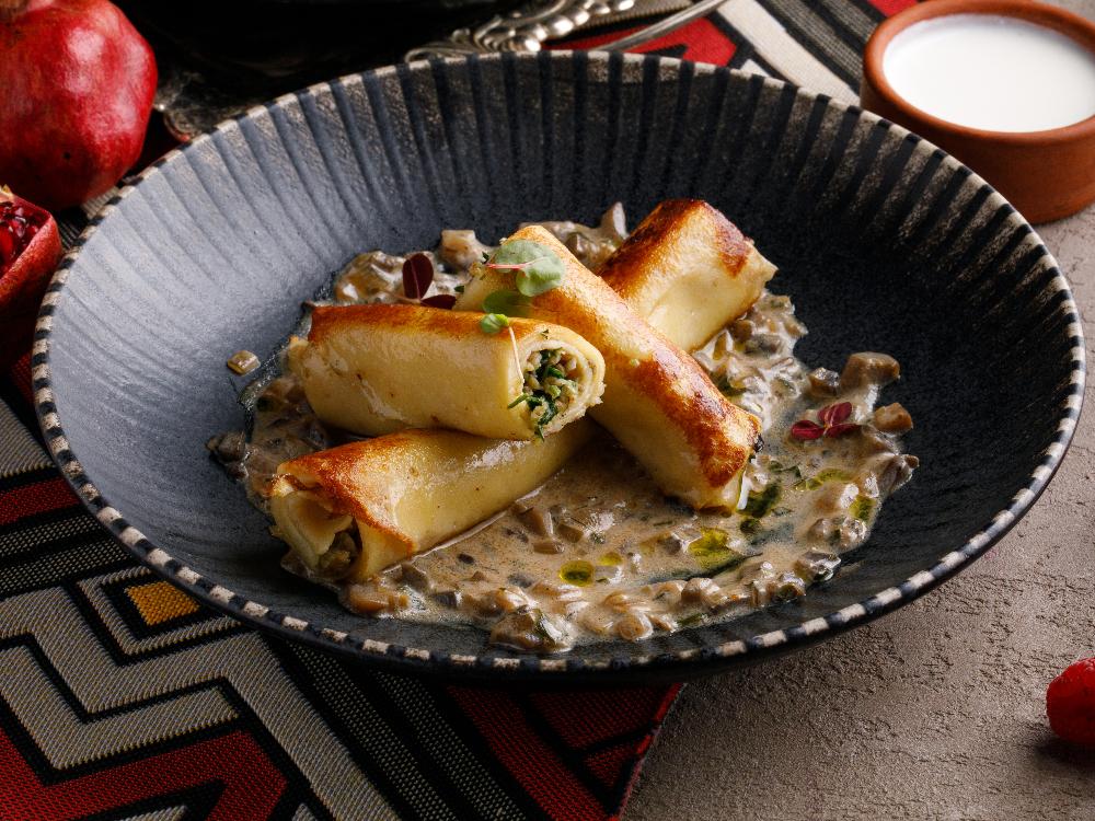 Поджаристые блинчики с начинкой из говядины и свинины. Подаются с насыщенным сливочно-грибным соусом и трюфельным маслом.