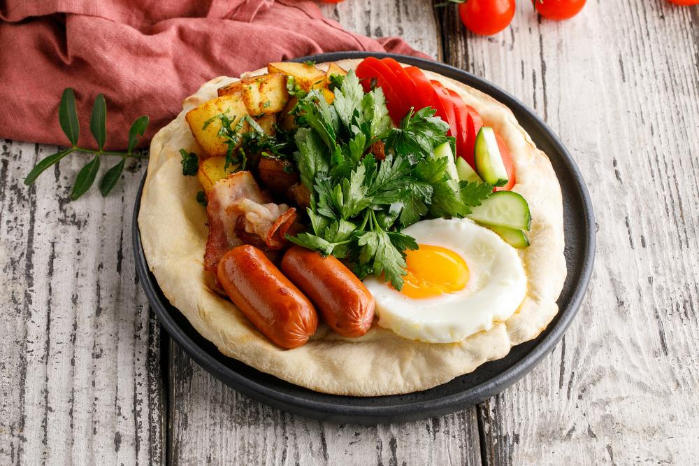 Описание:Состав: Сосиски, яйцо куриное, картофель, петрушка, кинза, соль, бекон, огурцы, помидоры, масло растительное, пита пшеничная (мука, яйцо, соль, маргарин, молоко, сахар, дрожжи).