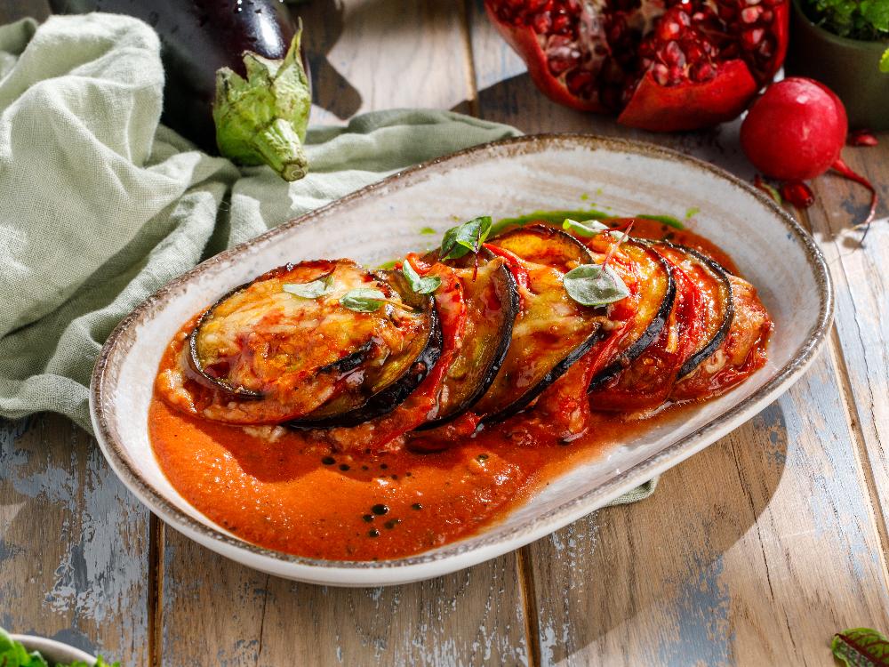 Запечённый баклажан с расплавленным сыром, томатами и соусом наршараб сочетает землистую терпкость, сладость и лёгкую кислинку в тягучей текстуре.