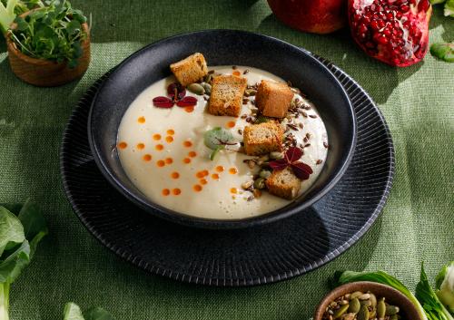 Бархатистый крем-суп из цветной капусты и кокосового молока. Подаётся с миксом семечек, сухариками из зернового багета и маслом грецкого ореха.