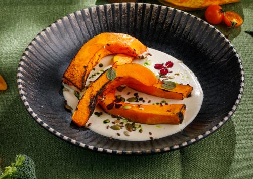 Тыква, запечённая с оливковым маслом, тимьяном, чесноком и сванской солью, с соусом из тофу и кокосового молока.
