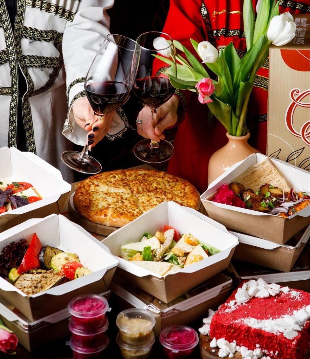 4 шт Хинкали с бараниной и говядиной, 4 шт Хинкали с говядиной и свининой, 4 шт Хинкали с говядиной, Свекла с сыром дорблю - 2 шт, Салат Цезарь - 2 шт, Хачапури по-мегрельски - 2 шт, Шашлык из индейки- 2 шт, Шашлык из свинины - 2 шт, Сезонные свежие овощи - 2 шт, Овощи на гриле - 2 шт, Соус сацебели - 6 шт