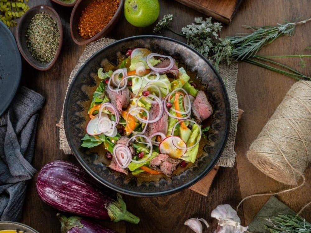 Свежий осенний сатат с ростбифом, миксом зелени и овощей