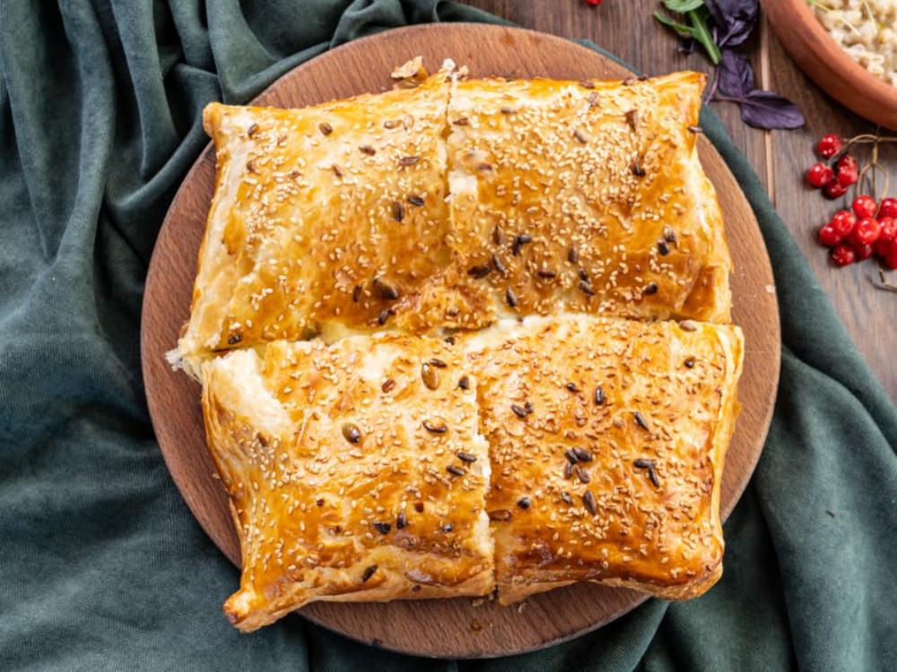 Хачапури из хрустящего слоёного теста с грузинскими сырами и миксом семечек.