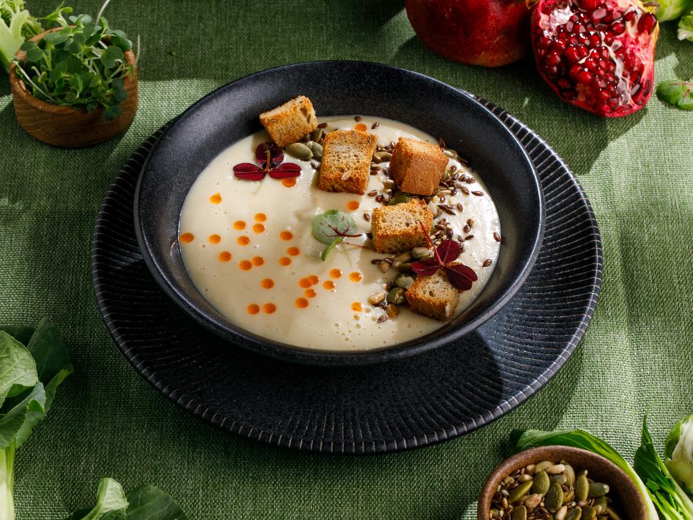 Бархатистый крем-суп из цветной капусты и кокосового молока. Подаётся с миксом семечек, сухариками из зернового багета и маслом грецкого ореха.