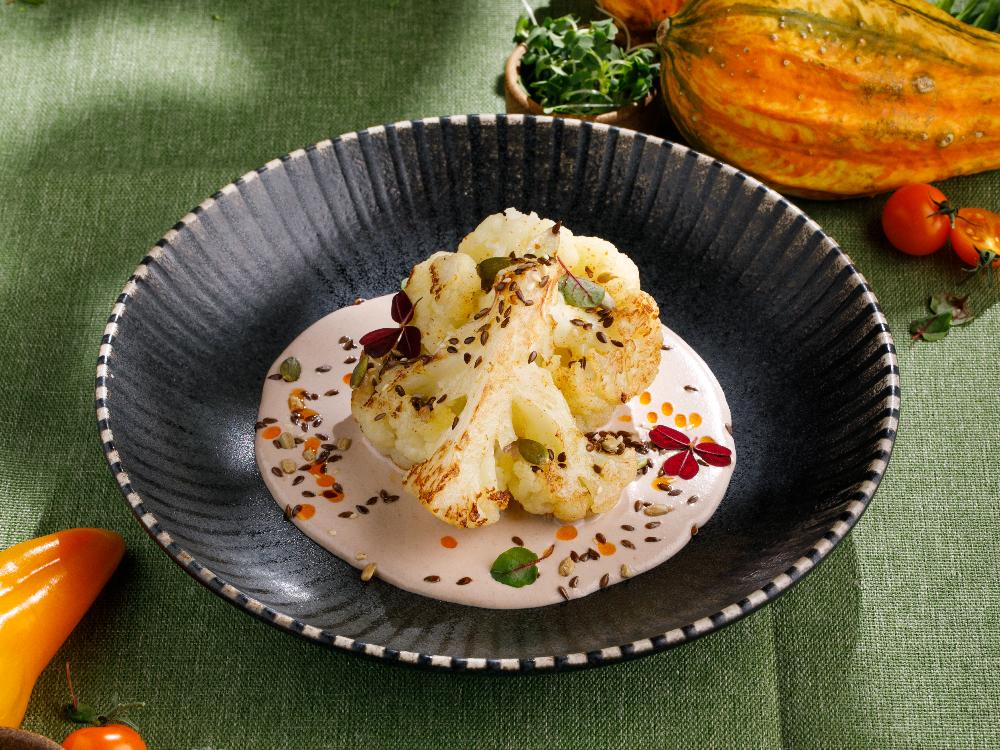 Стейк из цветной капусты с пикантным соусом на основе кокосового молока, соевого и бальзамического соусов и грецкого ореха.