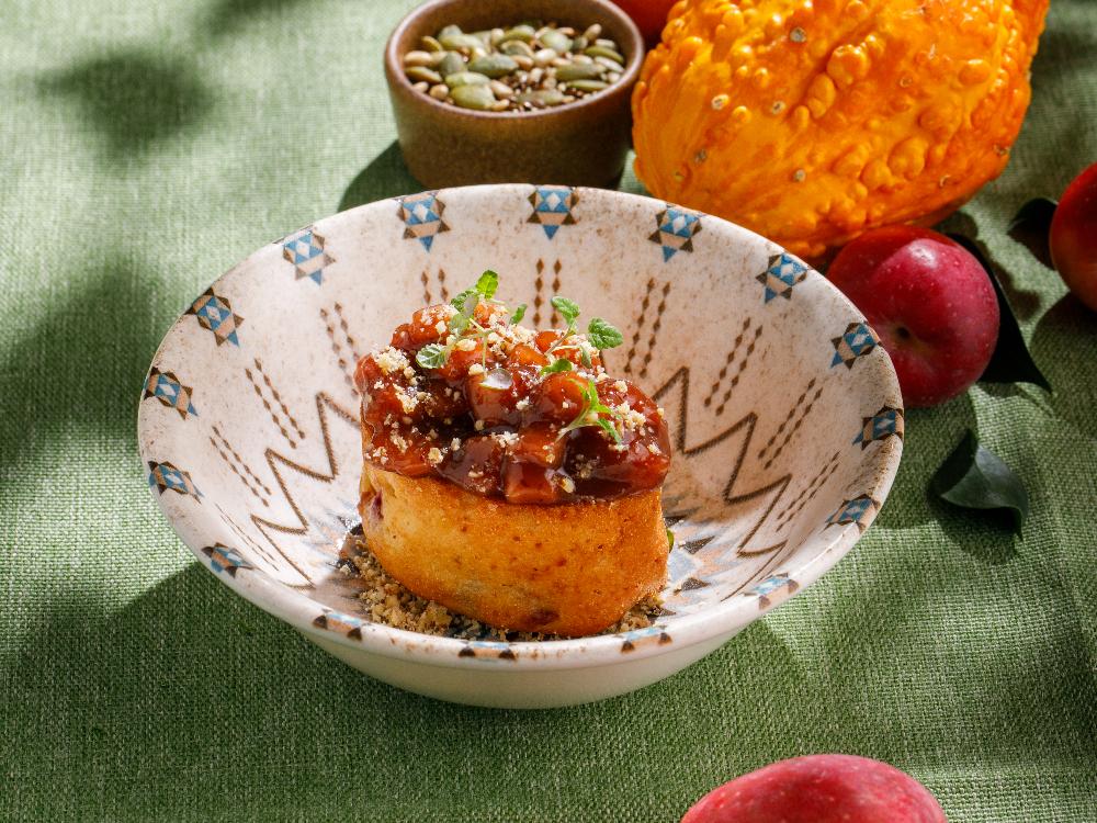 Воздушная шарлотка с кусочками сливы, подаётся с яблоком, томлёным в сливовом соусе, и крошкой грецкого ореха.
