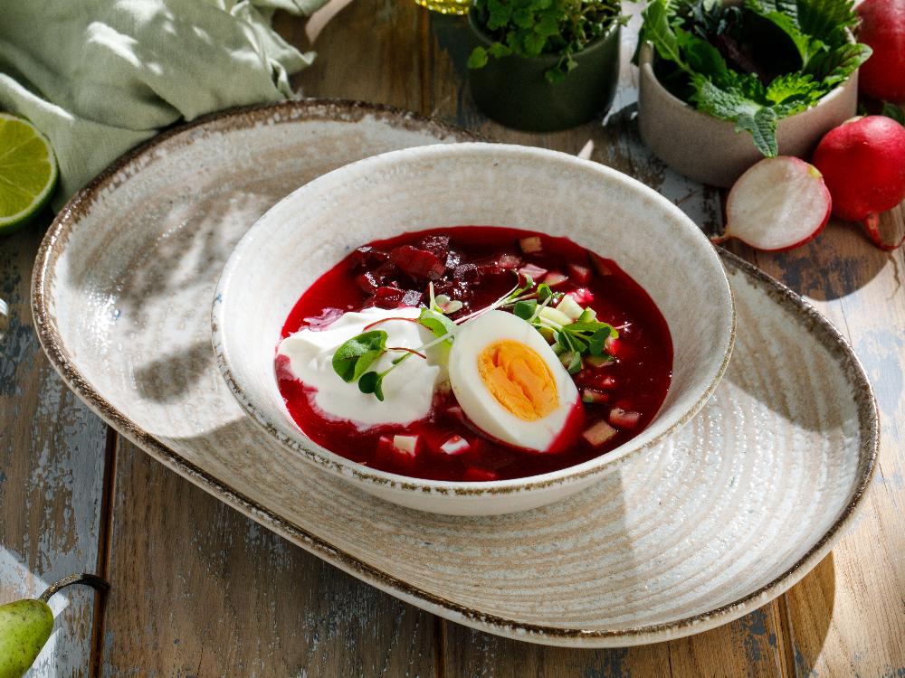 Освежающий холодный борщ со сладостью свёклы, лёгкой кислинкой уксуса и пряной остротой горчицы с хреном, дополненный куриным филе, огурцом и плотной текстурой овощей.