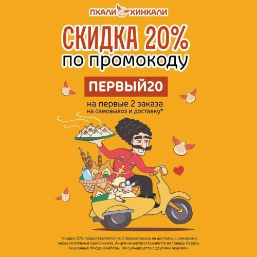 Скидка -20% на первые 2 заказа ДОСТАВКИ или САМОВЫВОЗА через мобильное приложение ПхалиХинкали (Великий Новгород). https://phali-hinkali.ru/app Любите грузинскую кухню, но не всегда есть время или возможность посетить наш ресторан? Тогда отличная новость для вас! ПхалиХинкали предлагает удобную доставку вкусных и аутентичных грузинских блюд прямо к вам домой или в офис. Скидка предоставляется на первые 2 заказа доставки или самовывоза через мобильное приложение. Акция не распространяется на акционные блюда и наборы. Не суммируется с другими акциями.