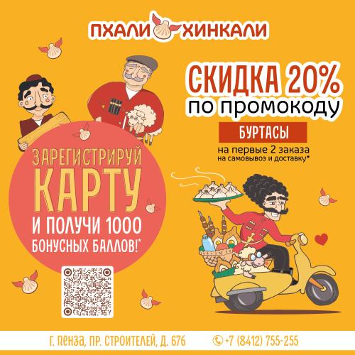 Генацвале, оформи первые 2 заказа на доставку или самовывоз со скидкой 20% в ПхалиХинкали Пенза по промокоду БУРТАСЫ. Вводи его при оформлении корзины в поле "промокод"!