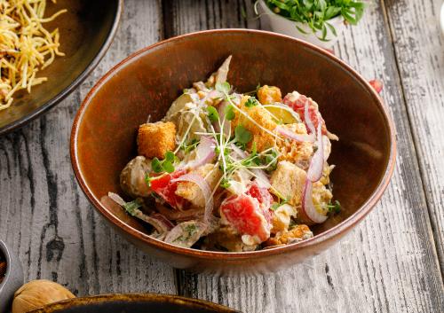 Сытный салат с томлёной свининой, маринованным луком, чесночным соусом, картофелем пай, перепелиным яйцом, соусом наршараб