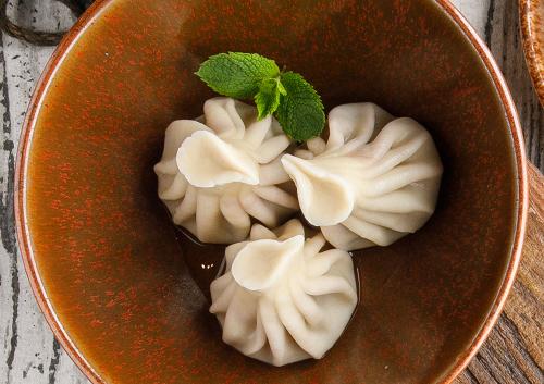 Сладкие хинкали с вишней, яблоком, корицей и освежающей мятой, со сметаной или мацони на выбор.