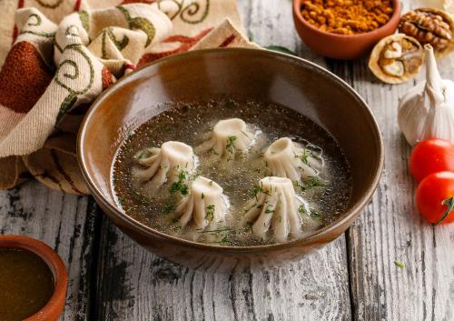 Мини-хинкали с пряным фаршем из говядины и свинины в наваристом курином бульоне с добавлением рубленого ароматного укропа.