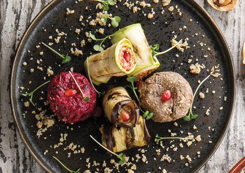 Традиционная закуска из овощей и грецкого ореха - с баклажаном, свёклой, болгарским перцем, грибами и зёрнами граната.