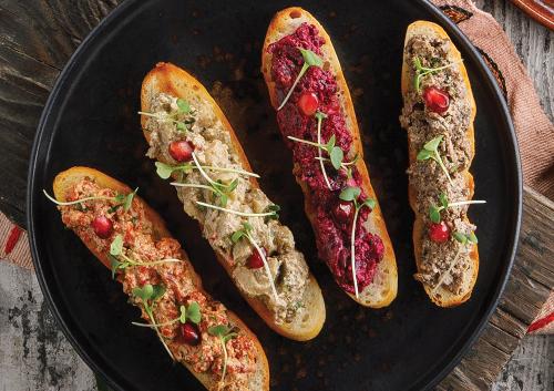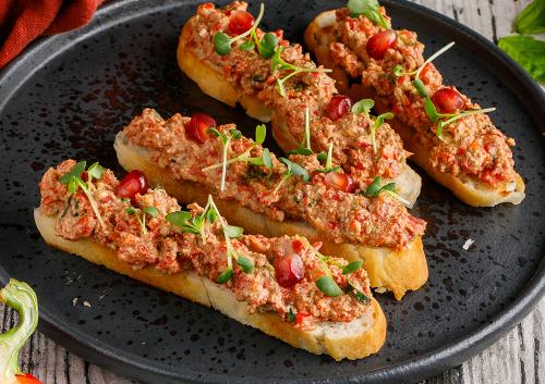 Легкая нежная овощная закуска в виде 4-х пхали с болгарским перцем на хрустящем обжаренном грузинском лаваше.