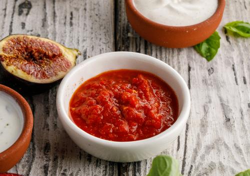 Острая аджика, приготовленная на основе помидоров с добавлением болгарского перца, лука и грузинских специй.