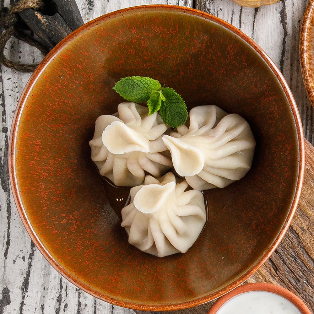 Сладкие хинкали с вишней, яблоком, корицей и освежающей мятой, со сметаной или мацони на выбор.