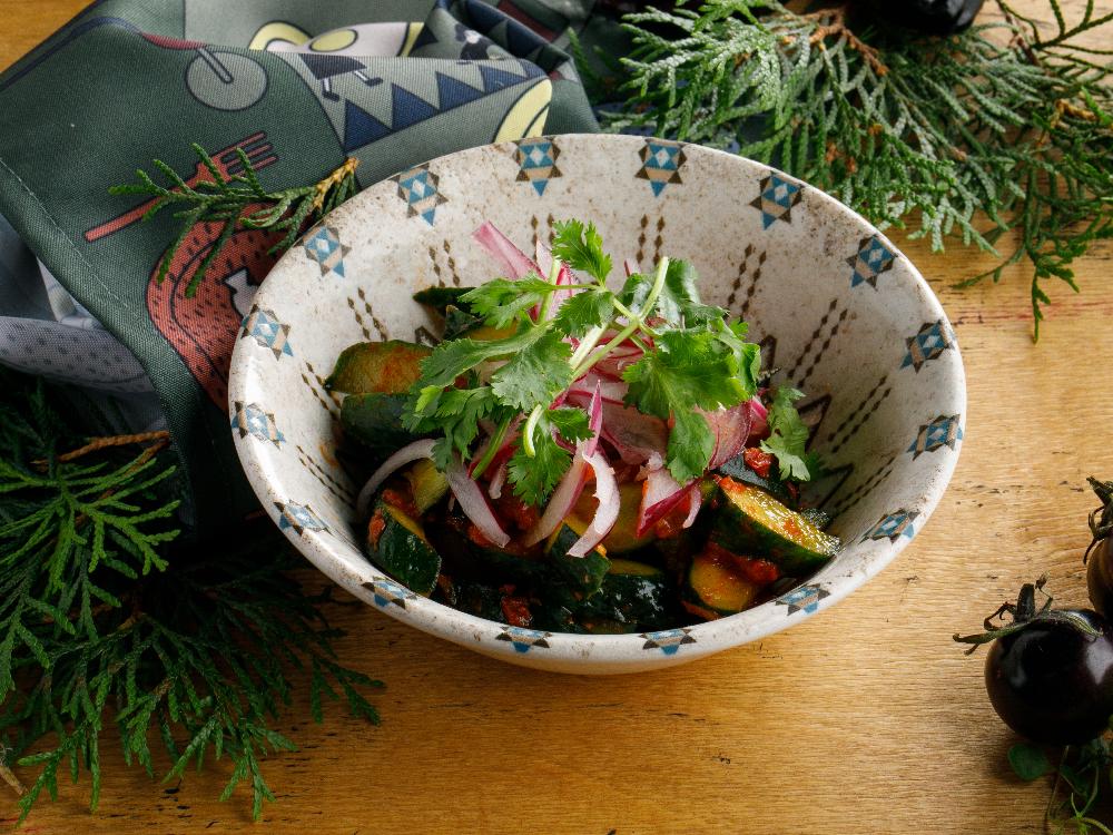 Описание:Состав: огурцы малосольные (огурцы св, вода минеральная, соль, сахар, укроп, чеснок) , соус аджика (перец болгарский, помидоры, чеснок, томатная паста, сп.аджика сухая, чили перец молотый), лук красный маринованный (лук красный, соль, сахар, уксус столовый 9%), кинза свежая.