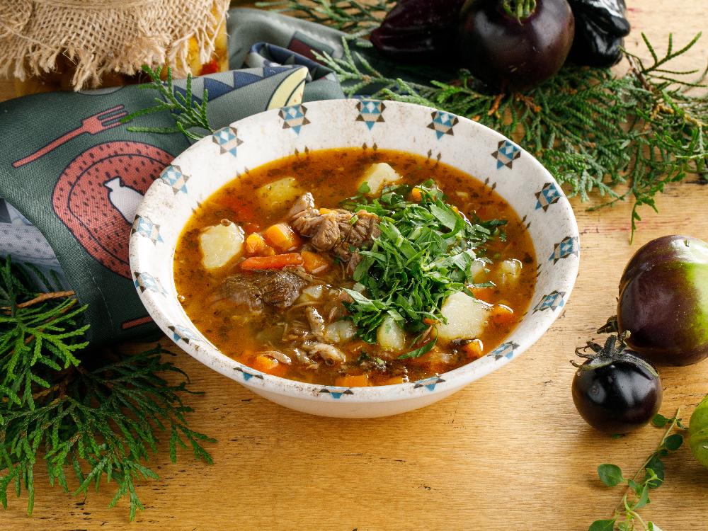 Согревающий ароматный суп на основе запечённой бараньей лопатки с овощами, грузинскими специями и тёмным пивом.