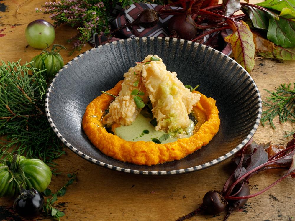 Нежная треска в хрустящей корочке в сочетании с необычным муссом из моркови, руколой и сливочным соусом из петрушки и чеснока.