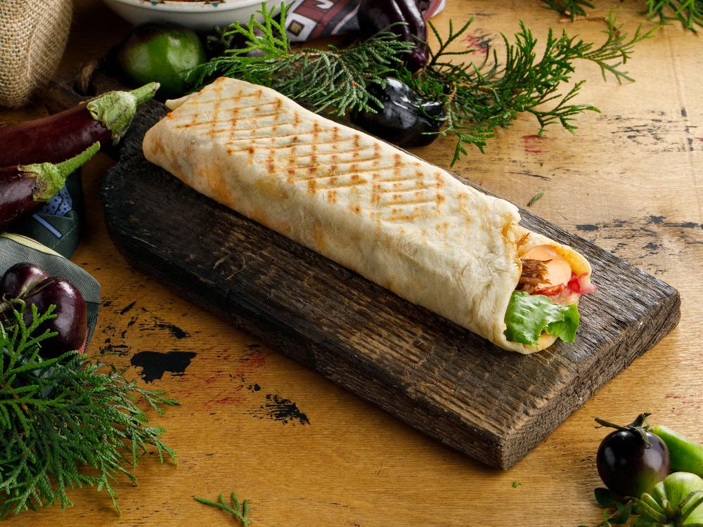 Новый взгляд на классику: шаверма с пряной томлёной свининой, сыром, свежими томатами, салатом айсберг и соусом барбекю.