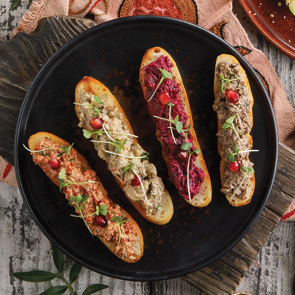 Шампиньоны с грецким орехом, грузинскими специями и зеленью на шоти с красным луком и гранатом.