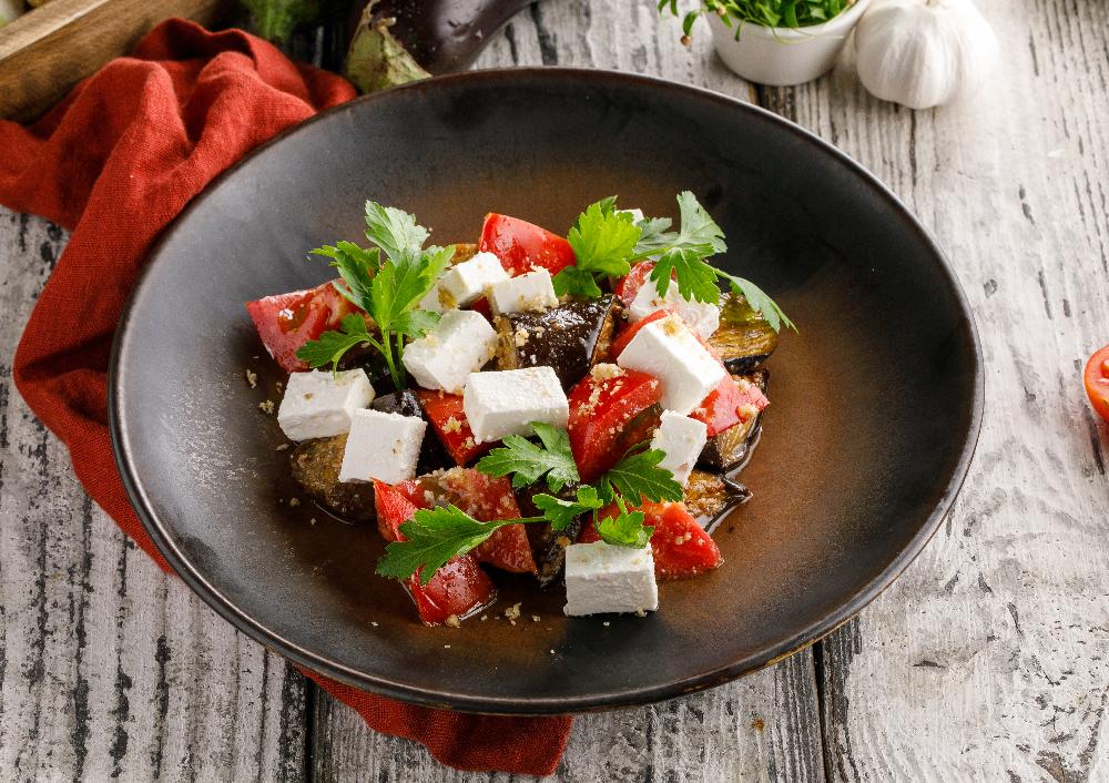 Салат с баклажаном, запеченным со специями, томатами, сыром фета и зеленью под ореховой заправкой с оливковым маслом.
