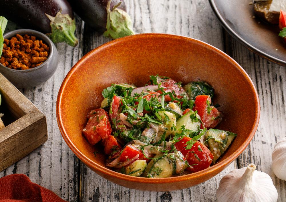 Традиционный салат из свежих томатов, огурцов, красного лука с ореховой заправкой, базиликом и зеленью.