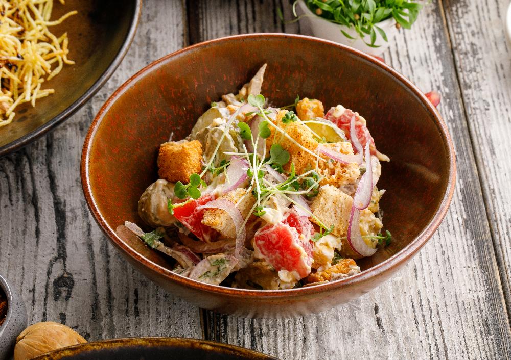 Салат с нежным говяжьим языком, хрустящими маринованными огурцами, запечённым картофелем, сочными помидорами, яйцом, гренками, красным луком и зеленью, заправленный майонезом.
