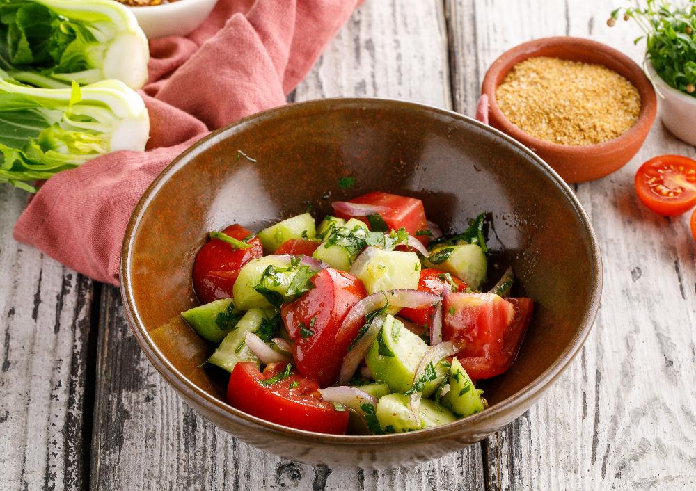 Описание:Состав: свежие помидоры, огурцы, красный лук, базилик, зелень микс (кинза, петрушка), масло нерафенированное ароматное, сванская соль
