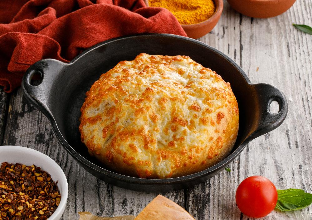 Блюдо с золотистой сырной корочкой сверху, и ароматным бифштексом из баранины и говядины внутри, с пряными специями и чесночным соусом