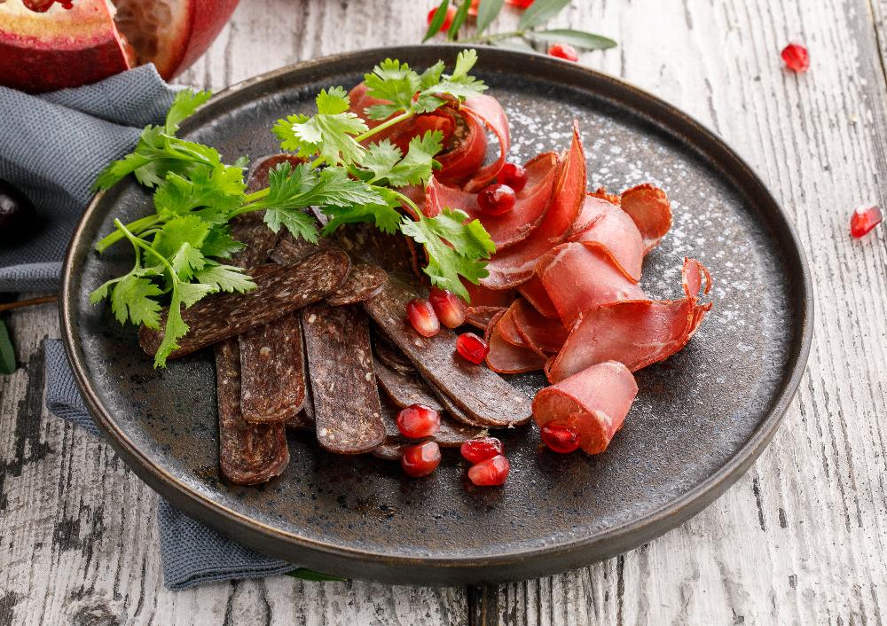 Бастурма из говядины, суджук из говядины, зёрна граната, зелень.