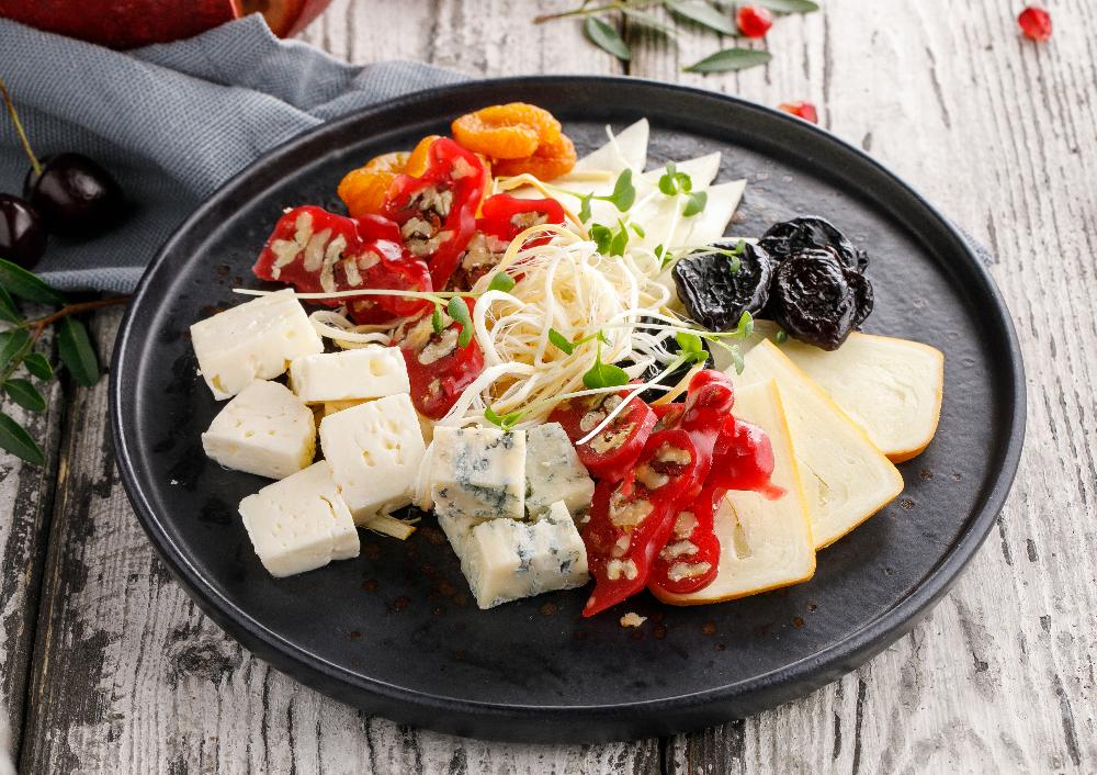 Нежный имеретинский сыр, сыр сулугуни, копчёный сулугуни и нити сыра чечил, сыр дорблю, курага, чернослив, чурчхела и микрозелень.