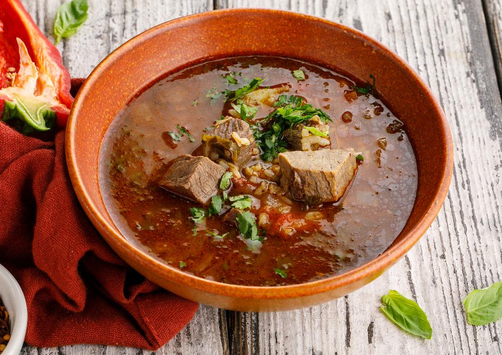 Наваристый говяжий бульон со спелыми томатами в собственном соку, рисом, репчатым луком, пряными грузинскими специями, свежей зеленью.