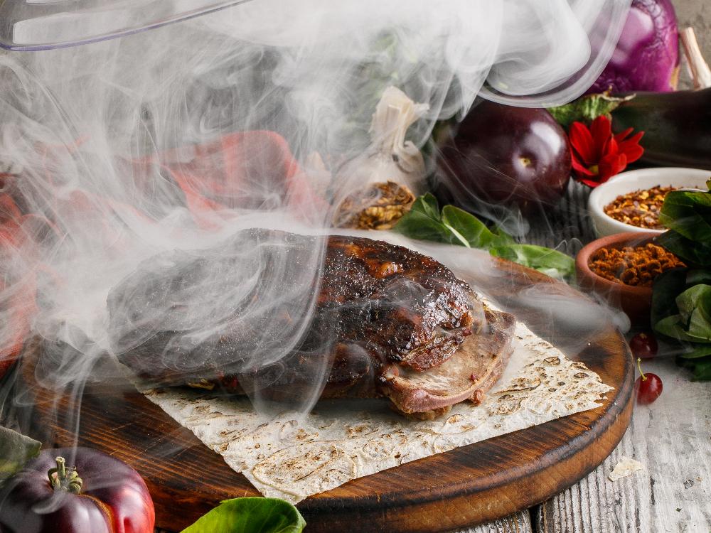 Запечённая баранья лопатка на кости с пряными травами, глазированная соусом. Подаётся с задымлением на опилках под клошем.