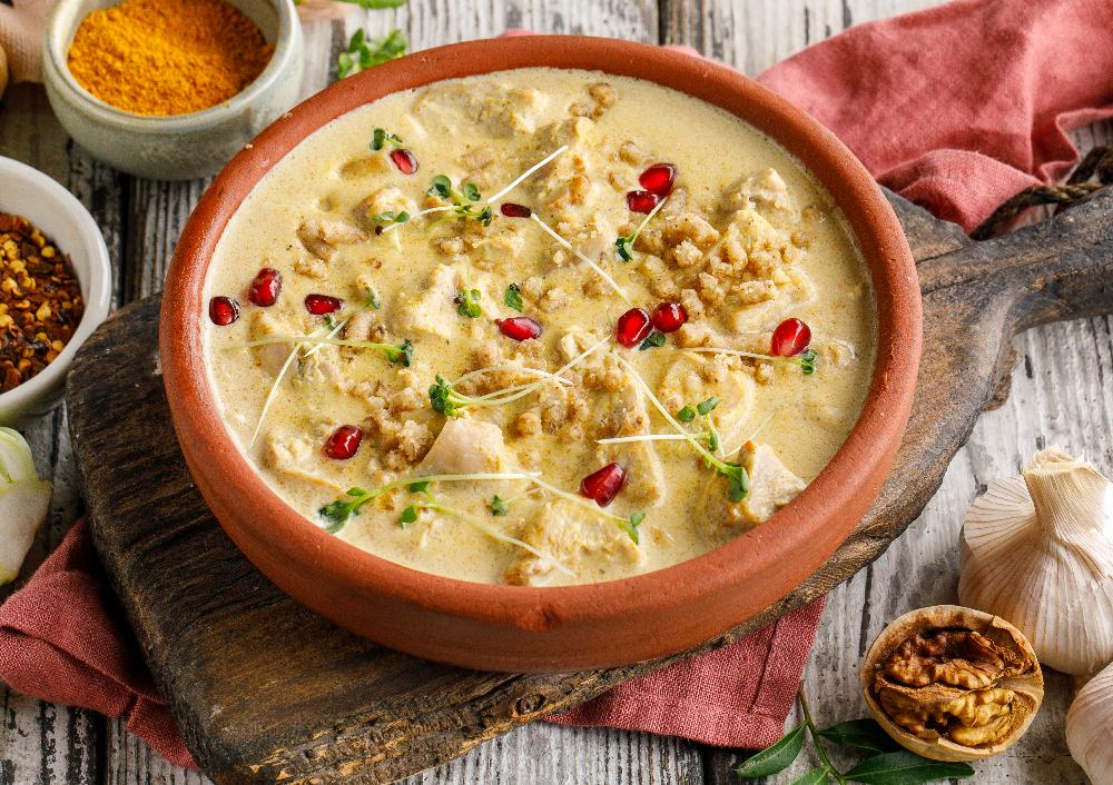 Запеченная курица в сливочно-чесночном соусе с грецким орехом и зеленью.