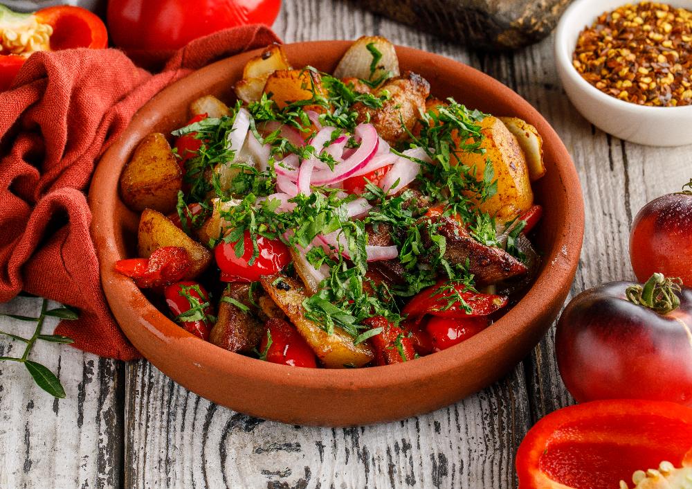 Обжаренная свинина с запечённым картофелем, репчатым луком, болгарским перцем, томатами и чесноком, с грузинскими специями и зеленью.
