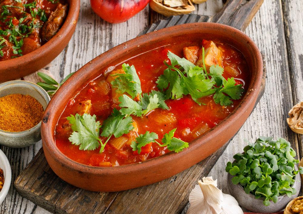 Курица, томлёная в томатном соусе с болгарским перцем, чесноком, зеленью и грузинскими специями.