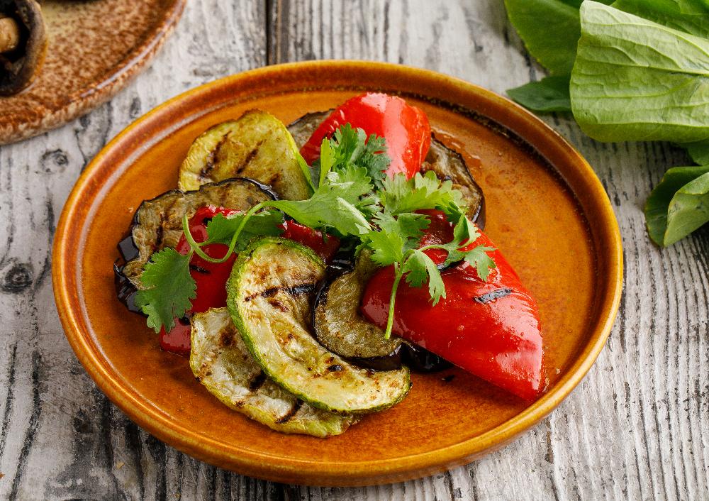 Запечённые цукини, болгарский перец и баклажан с добавлением специй.