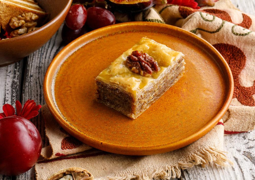 Восточная сладость из слоёв тонкого теста с грецким орехом, пропитанная сладким сиропом с мёдом.