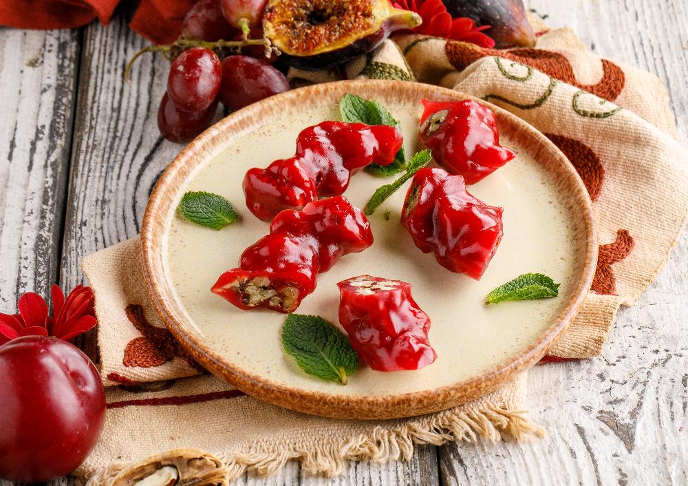 Традиционное грузинское лакомство: очищенные грецкие орехи в загущенном фруктовом соке.