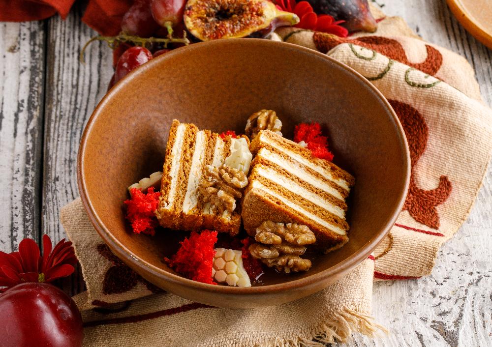 Медовик - классика вне времени! Наш медовик дополнен яблочно-инжирным соусом, воздушным бисквитным мхом, белым шоколадом и грецкими орехами.