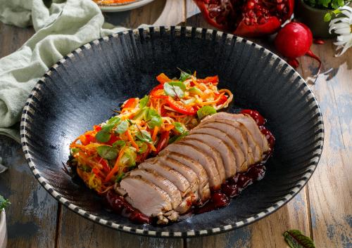 Сочная свиная вырезка с выраженным умами поданная с вишнёвым демиглясом, лёгкой сладостью овощей и сбалансированной кислотностью.