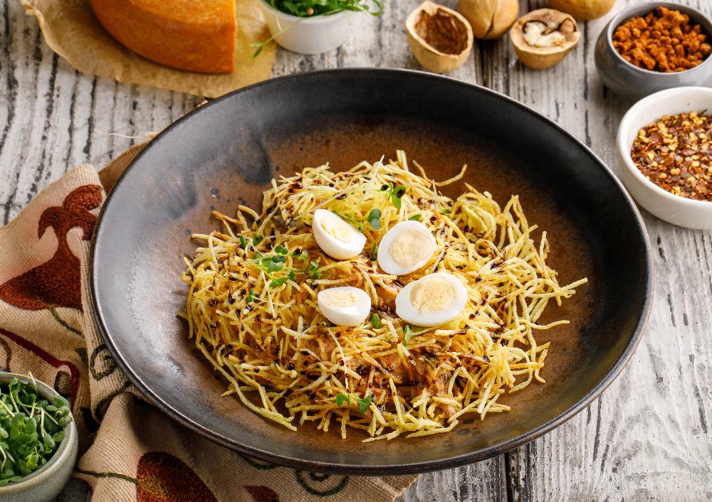 Сытный салат с томлёной свининой, маринованным луком, чесночным соусом, картофелем пай, перепелиным яйцом, соусом наршараб