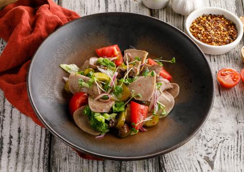 Салат с нежным говяжьим языком, хрустящими маринованными огурцами, запечённым картофелем, сочными помидорами, яйцом, гренками, красным луком и зеленью, заправленный майонезом.
