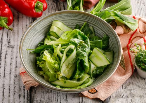Лёгкий зелёный салат с яркой свежей заправкой из сока лимона, оливкового масла и мёда.